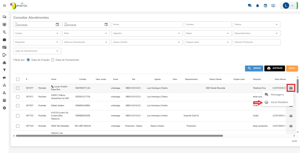 O Chat Oratrix permite exportar o histórico completo de conversas de um contato, facilitando o registro e a análise de atendimentos realizados pela equipe.