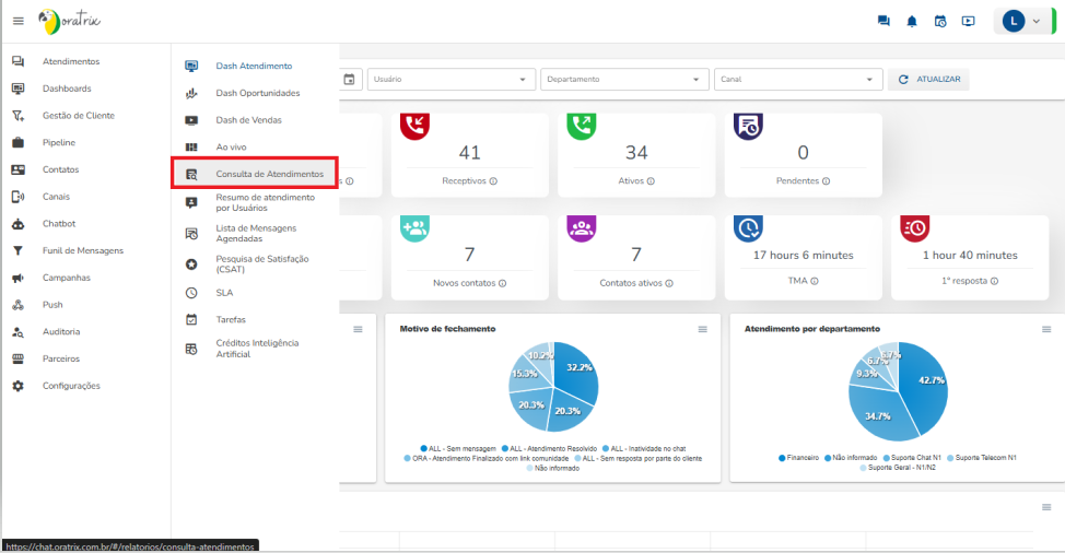 Acesse o painel inicial do Chat Oratrix com seu login.