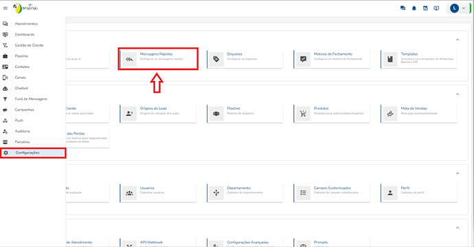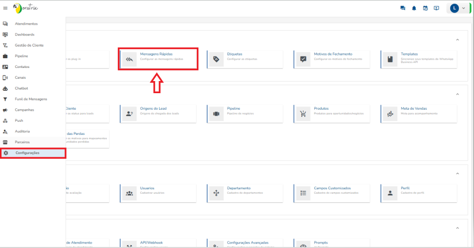 No menu inicial do Chat Oratrix procure por “Configurações” e selecione “Mensagens Rápidas”.