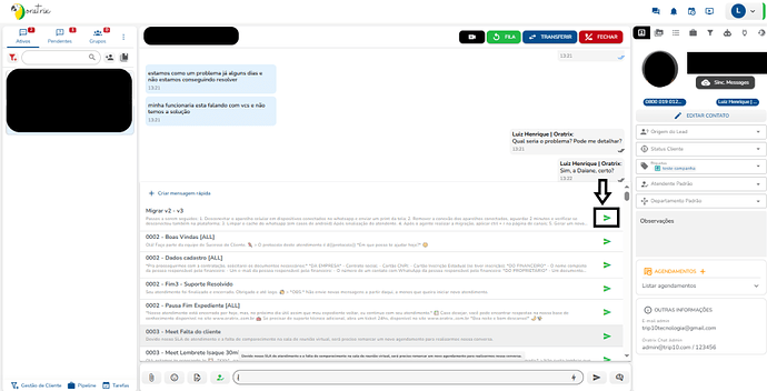 Para utilizar, basta estar em um atendimento e digitar “/ + Chave”, selecionar a mensagem e enviar.