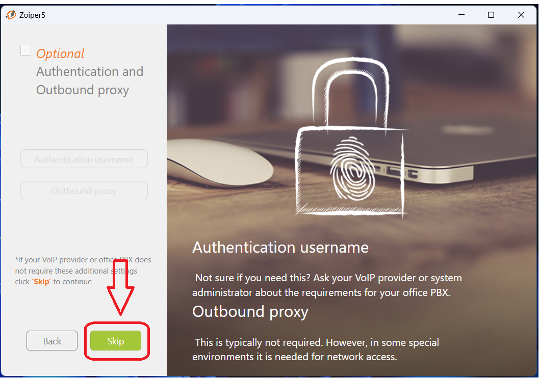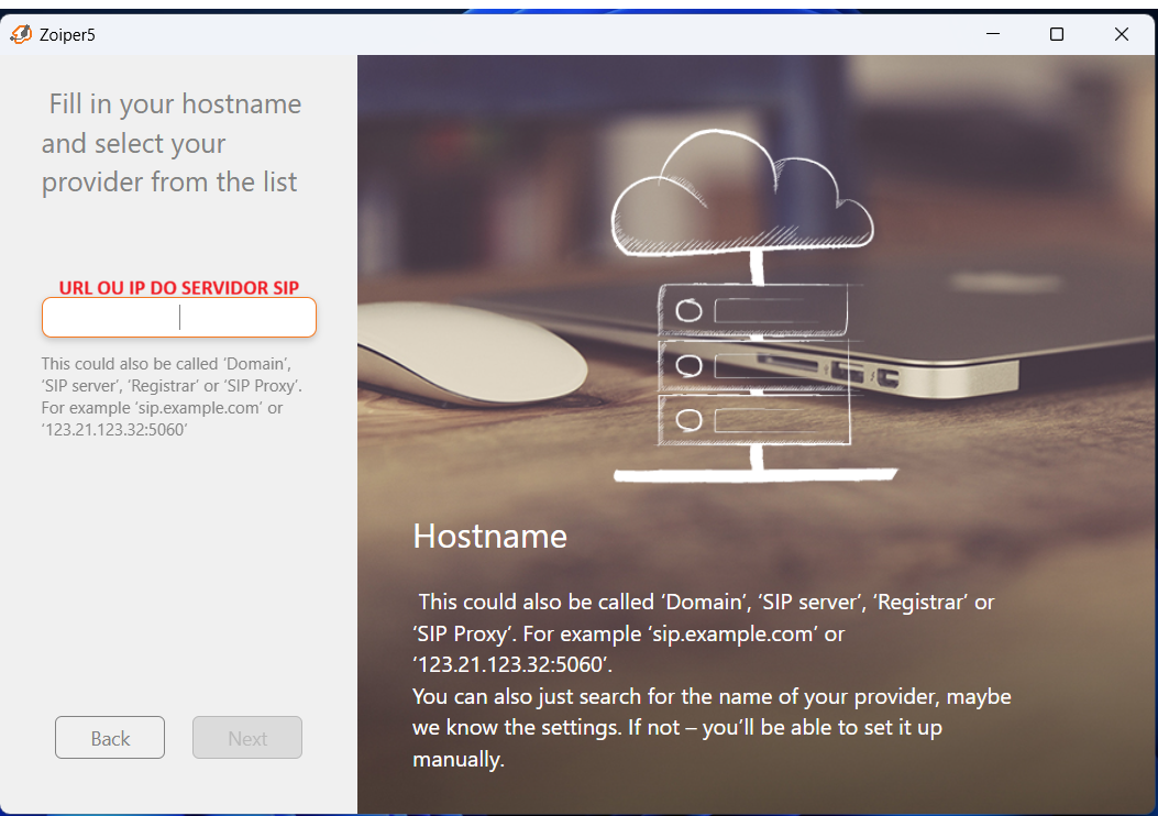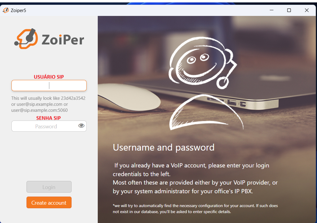 Ao abrir o Zoiper pela primeira vez, será exibida a tela inicial de configuração.