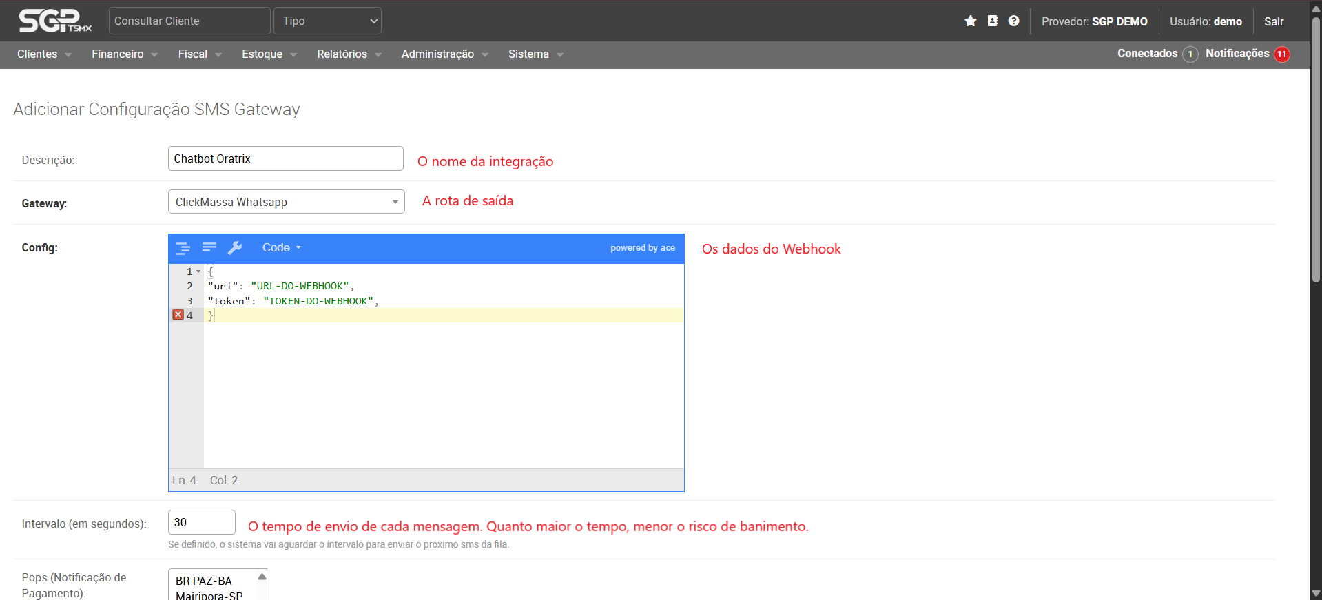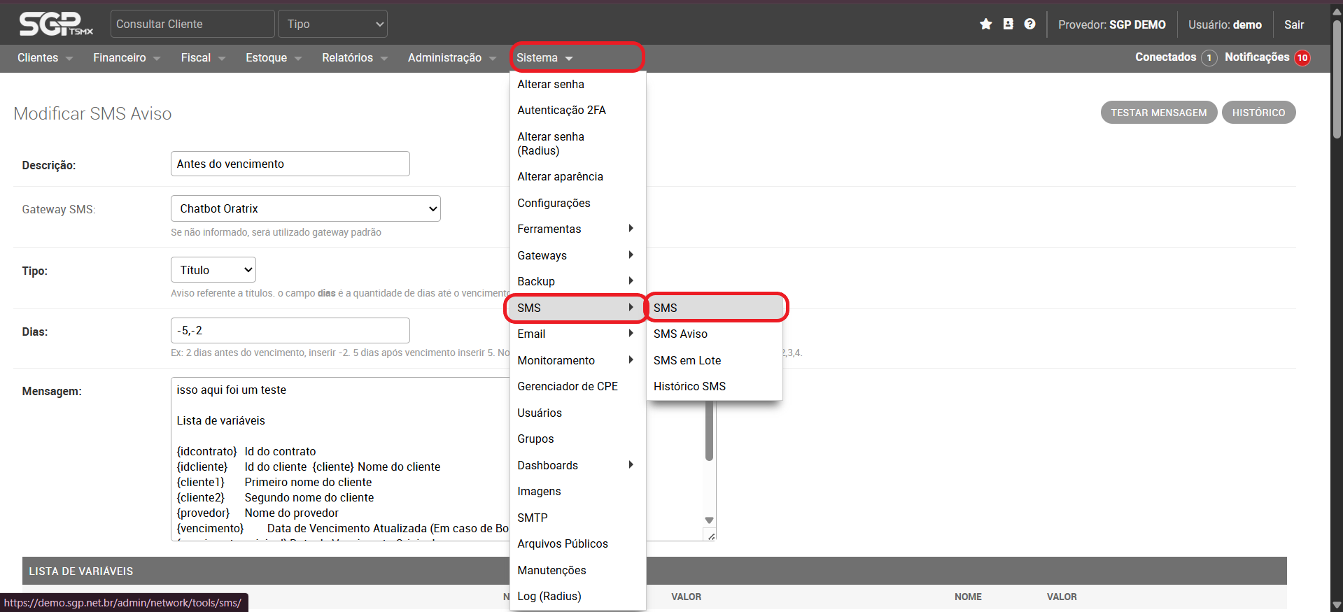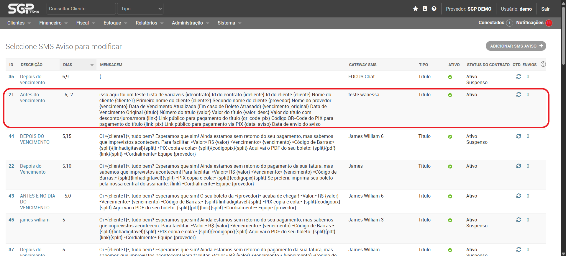 Agora vá no menu do SGP em Menu → Sistema → SMS → SMS Avisos