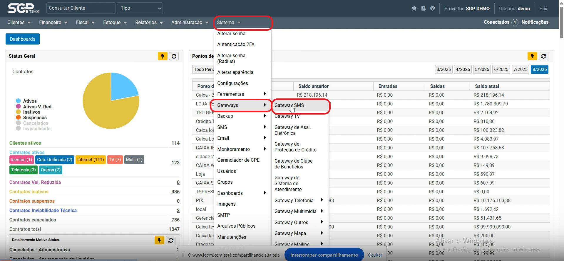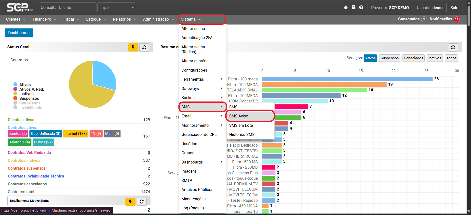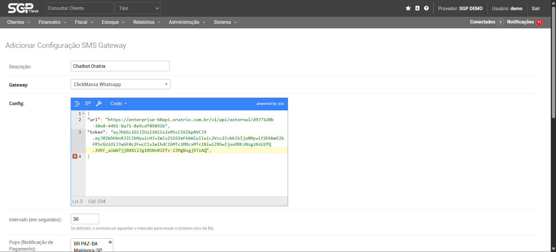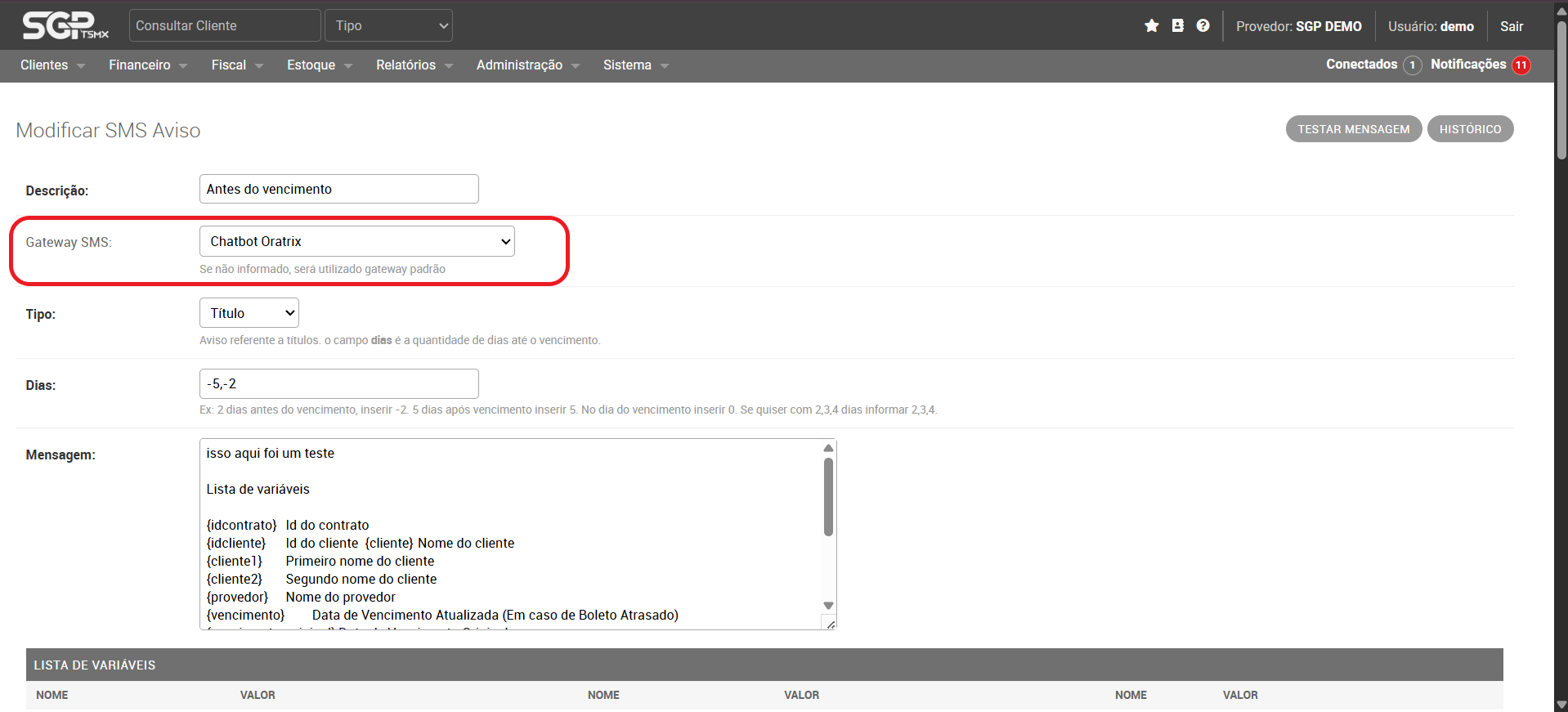 Agora vá no menu do SGP em Menu → Sistema → SMS → SMS Avisos