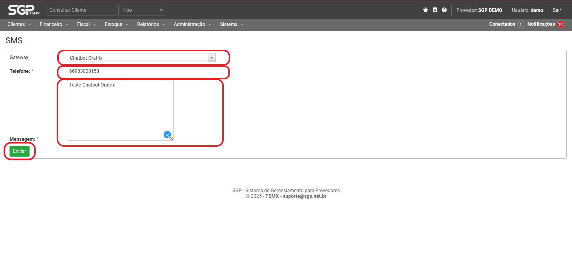 Para testar o envio vá até Menu → Sistema → SMS → SMS