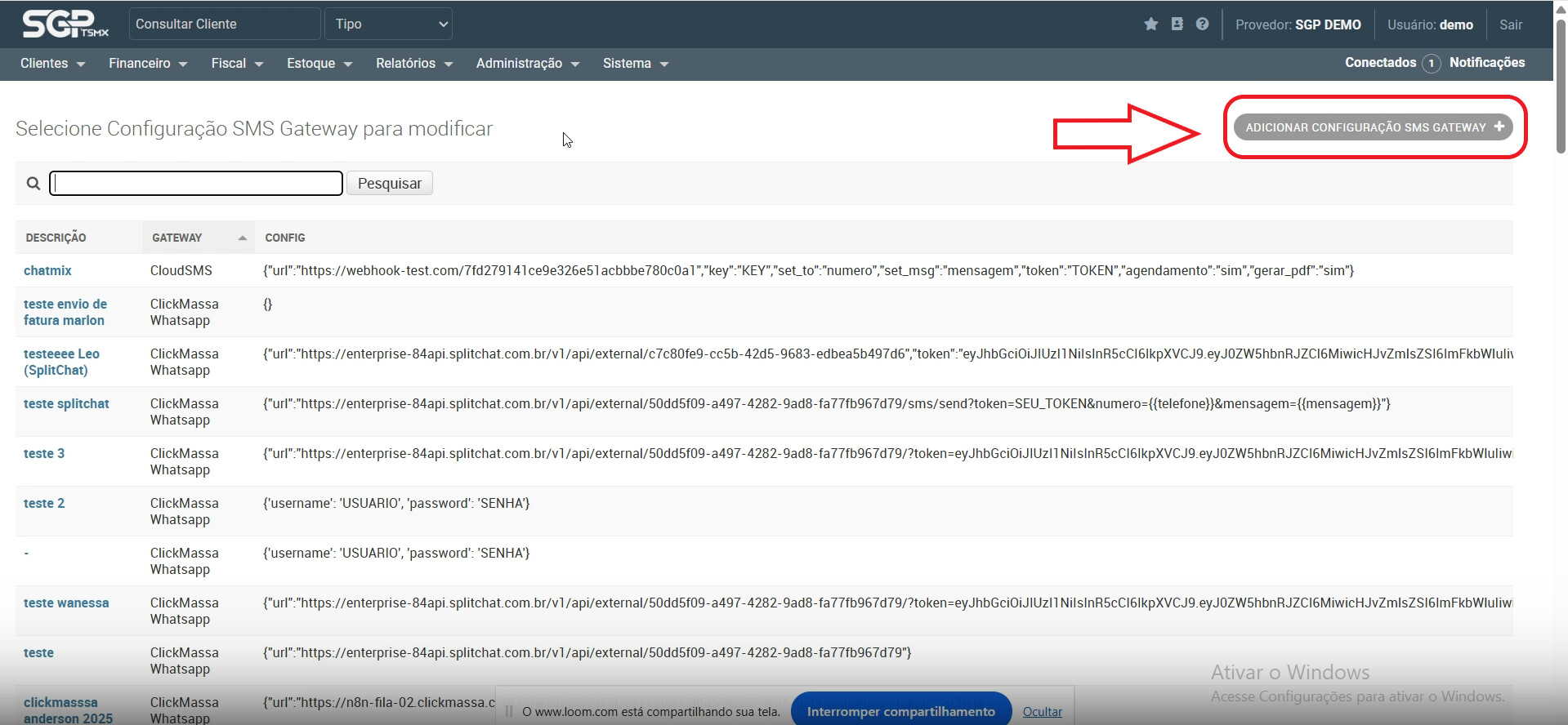 Clique em “Adicionar configuração sms gateway”.