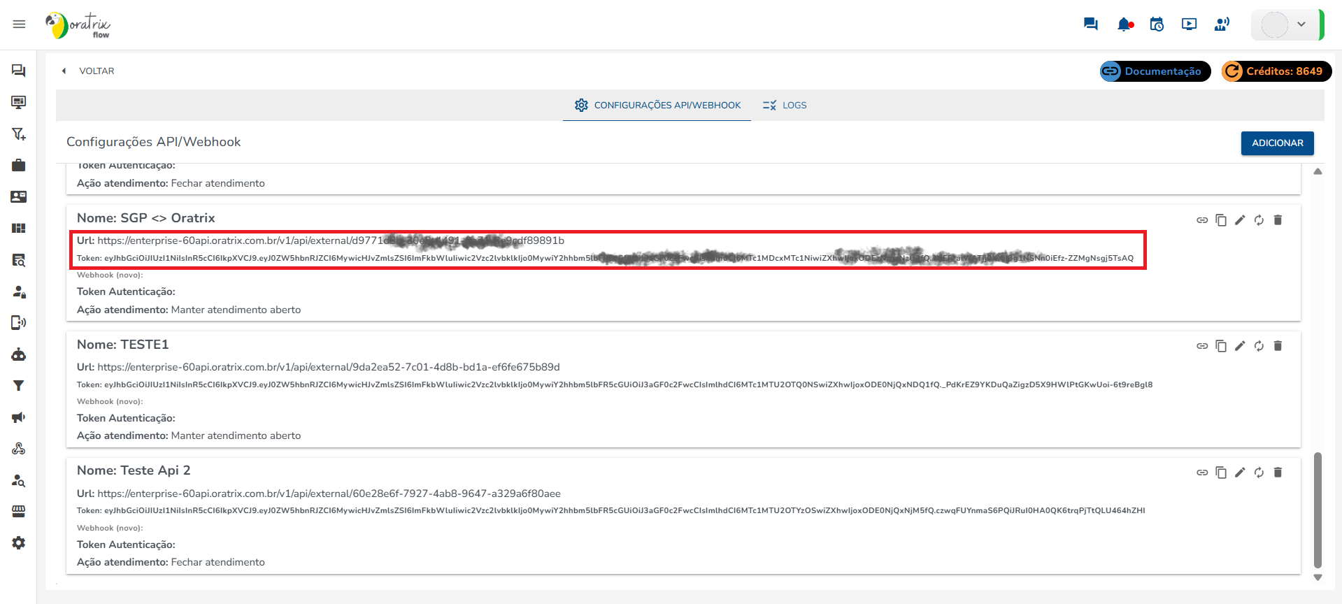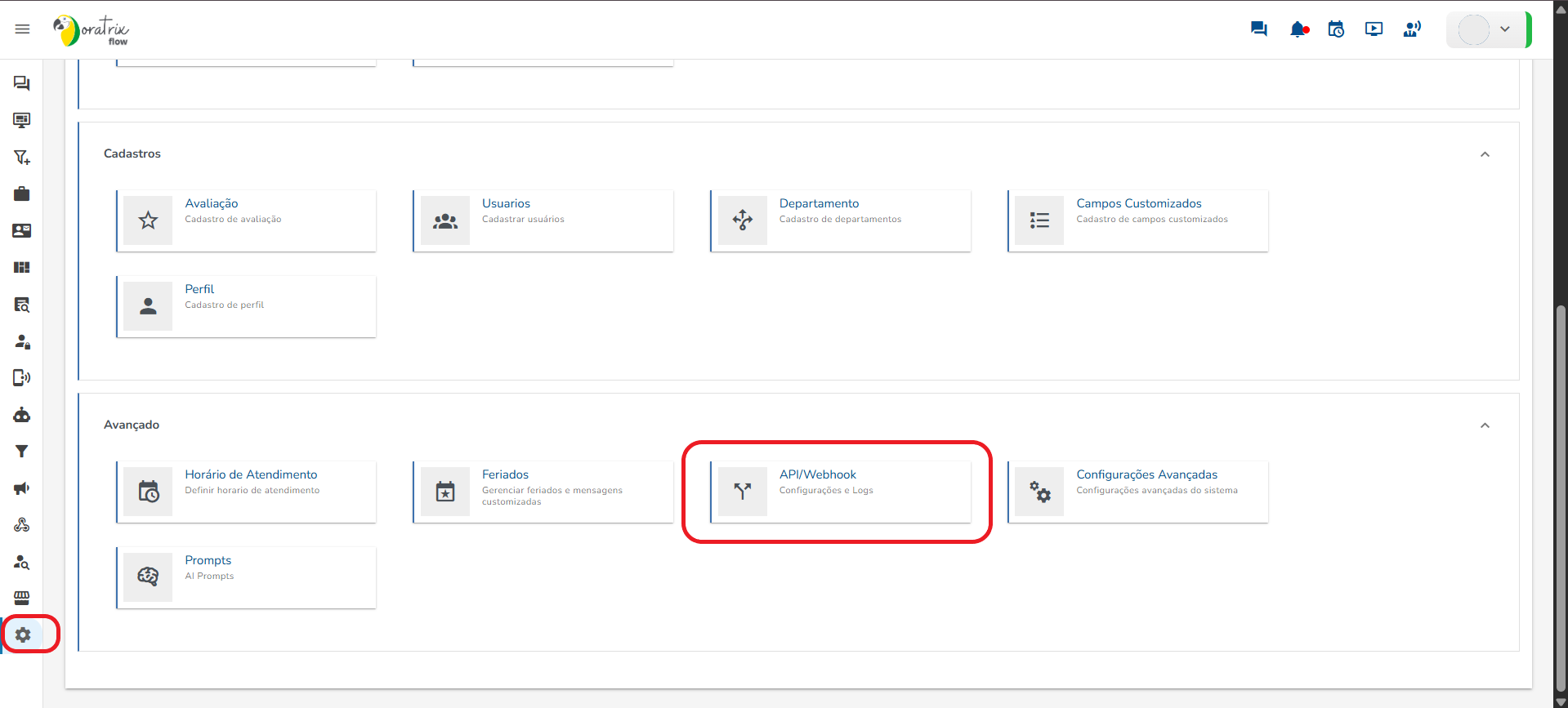 Para pegar os dados do Webhook, vá até o Chatbot Flow Oratrix e no menu vá em Configurações → API/Webhook